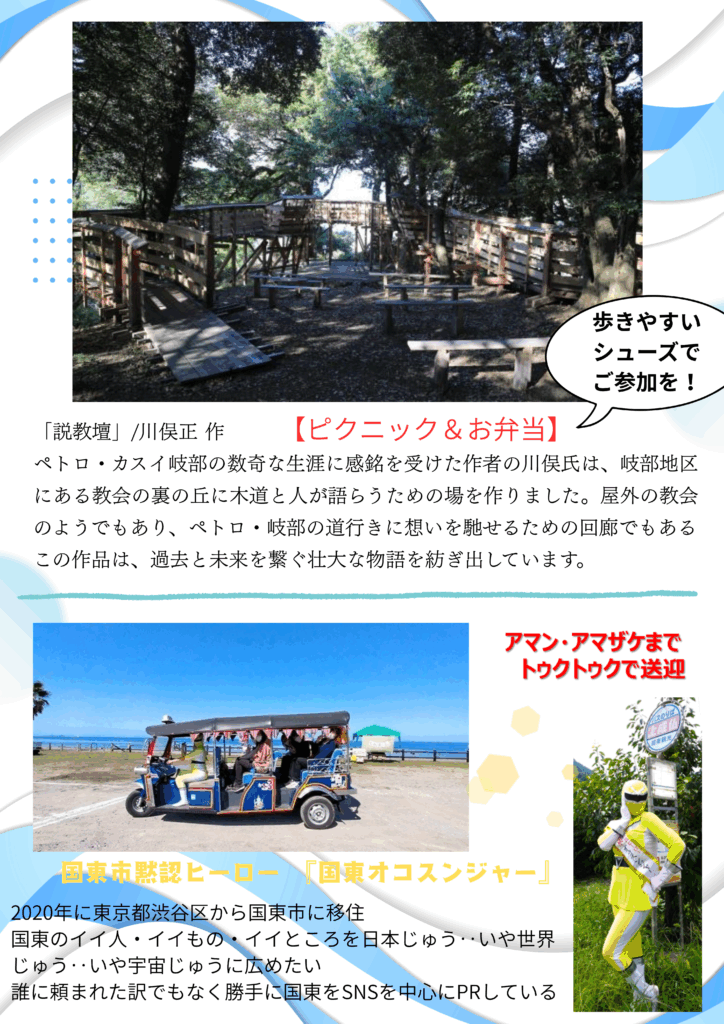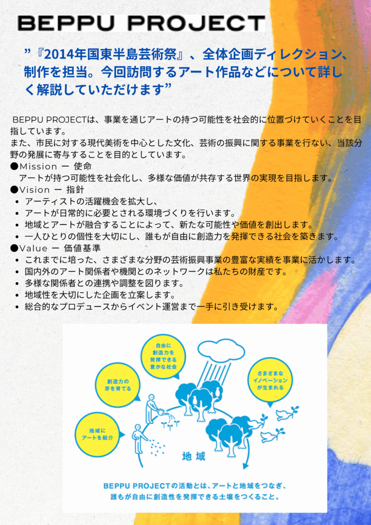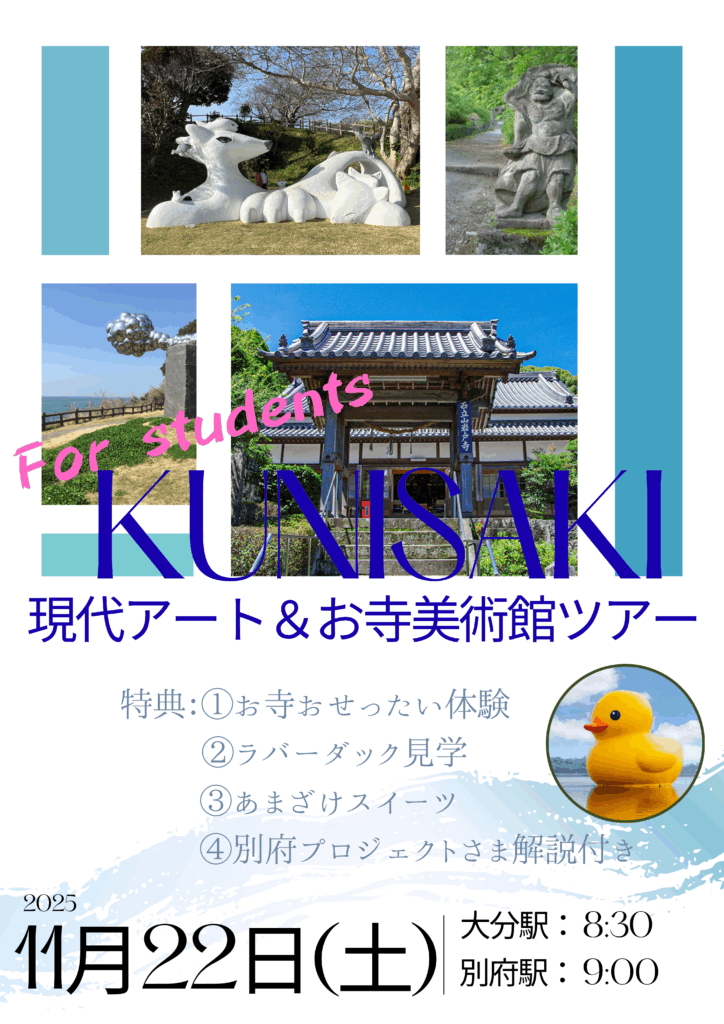大分駅8:30出発➡別府駅9:00出発➡花とアートの岬「長崎鼻」➡(現代アート)「説教壇」【弁当・昼食】➡岩戸寺(お寺美術館・おせったい)➡泉福寺(お寺美術館・おせったい)➡道の駅くにさき(休憩・買い物)➡フロレンティン・ホフマン「ラバーダック」(見学)➡アマン・アマザケ本舗(あまざけスイーツ)➡別府駅17:45➡大分駅18:15