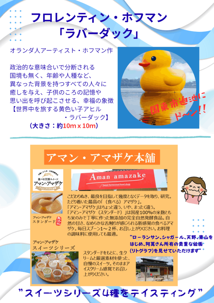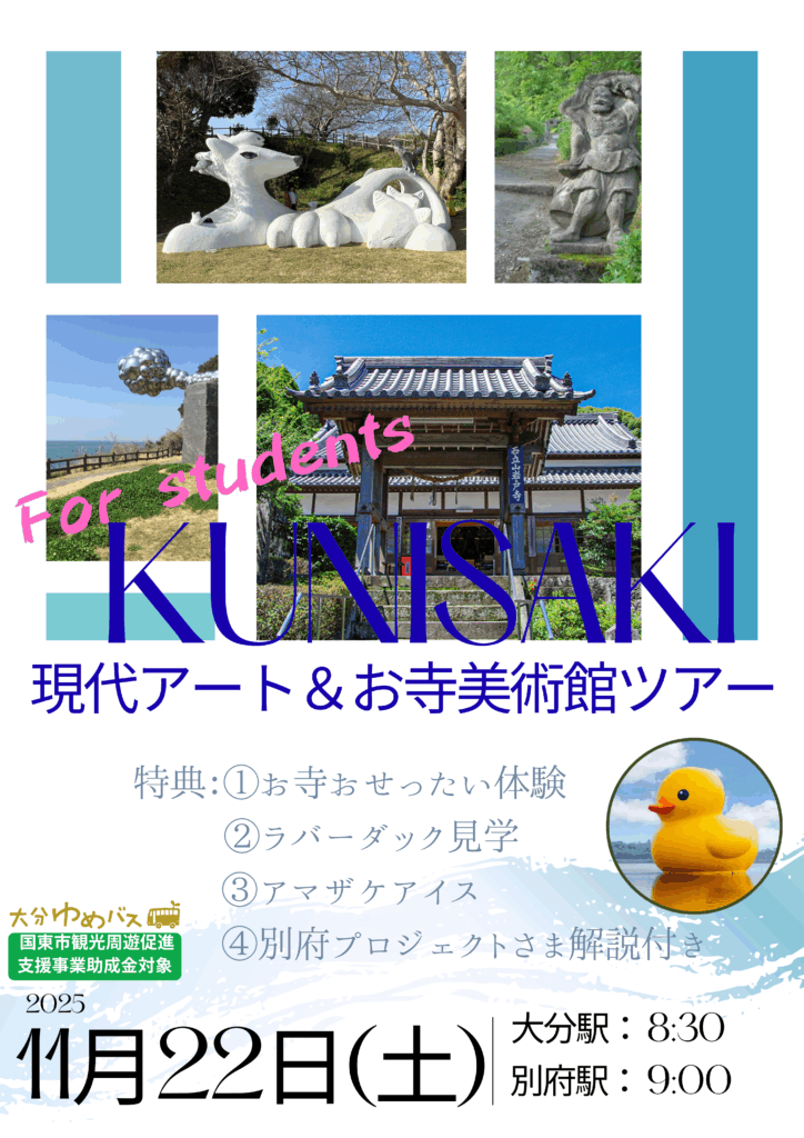 大分駅8:30出発➡別府駅9:00出発➡花とアートの岬「長崎鼻」➡(現代アート)「説教壇」【弁当・昼食】➡岩戸寺(お寺美術館・おせったい)➡泉福寺(お寺美術館・おせったい)➡道の駅くにさき(休憩・買い物)➡フロレンティン・ホフマン「ラバーダック」(見学)➡アマン・アマザケ本舗(あまざけスイーツ)➡別府駅17:45➡大分駅18:15