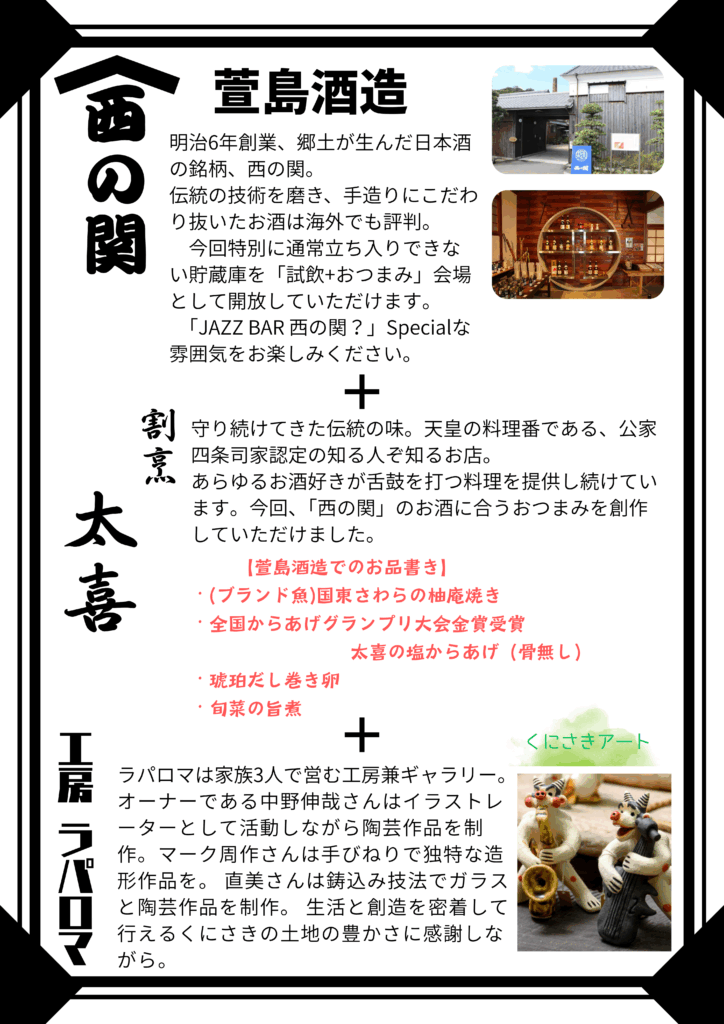 中津駅8:30出発➡宇佐市役所➡相原PA➡料亭助六➡アマン・アマザケ本舗➡萱島酒造➡空の里むさし➡南酒造➡シーガーデンひじ➡宇佐市役所➡中津駅